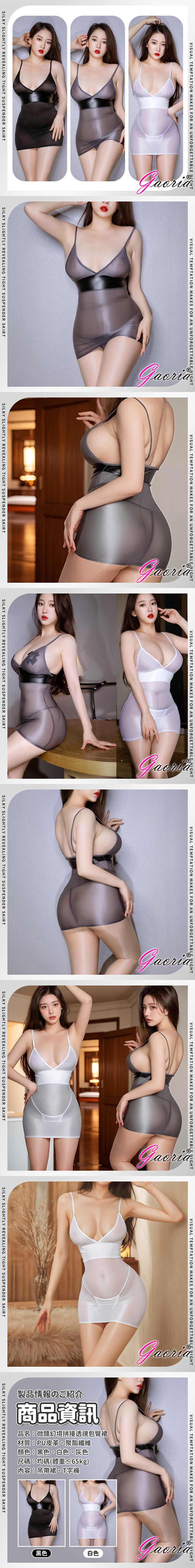 品名:微醺幻境拼接透視包臀裙材質:聚酯纖維顏色:黑色、白色、灰色尺碼:均碼(建議體重 < 65kg)內容:吊帶裙、T字褲